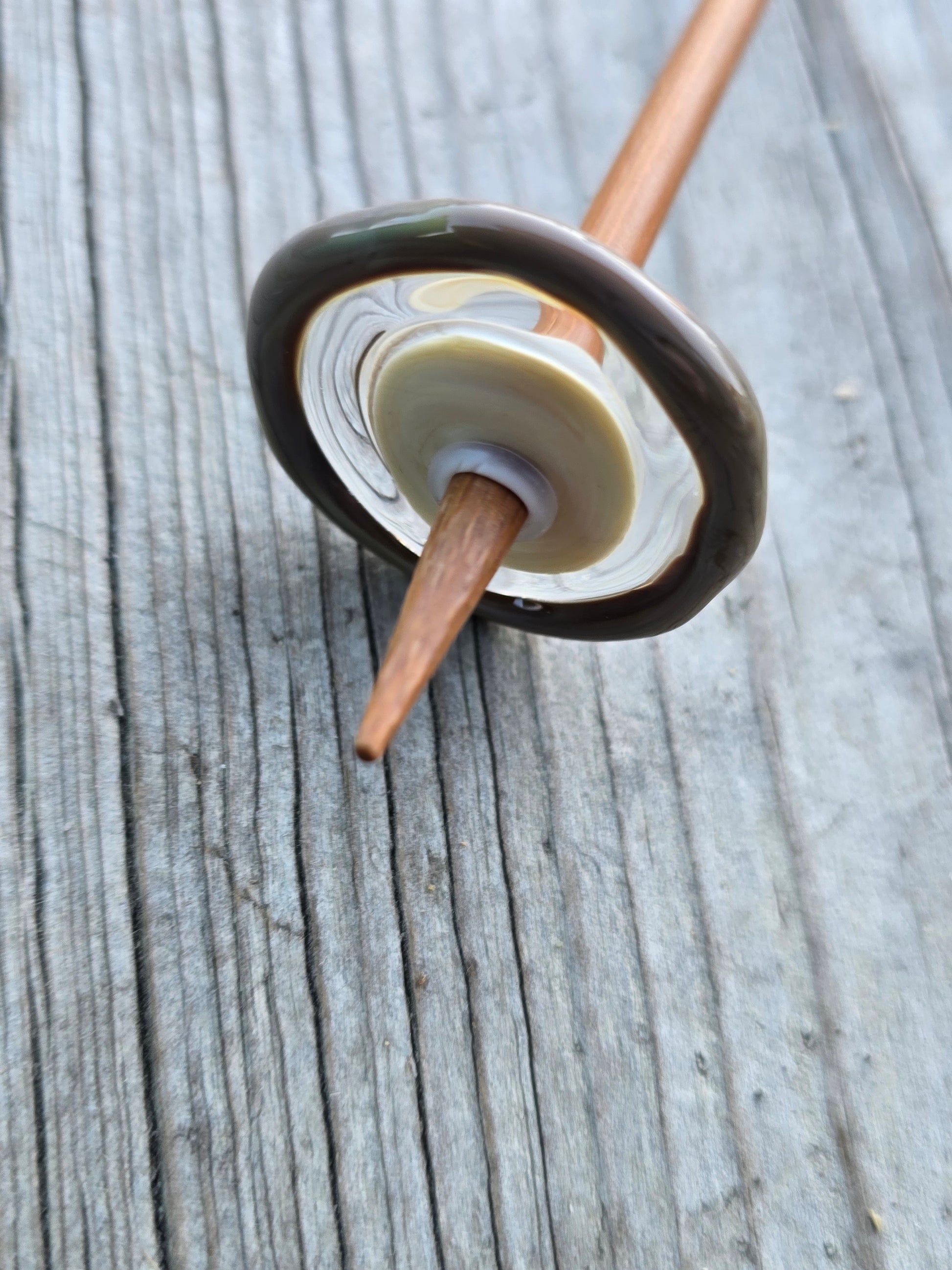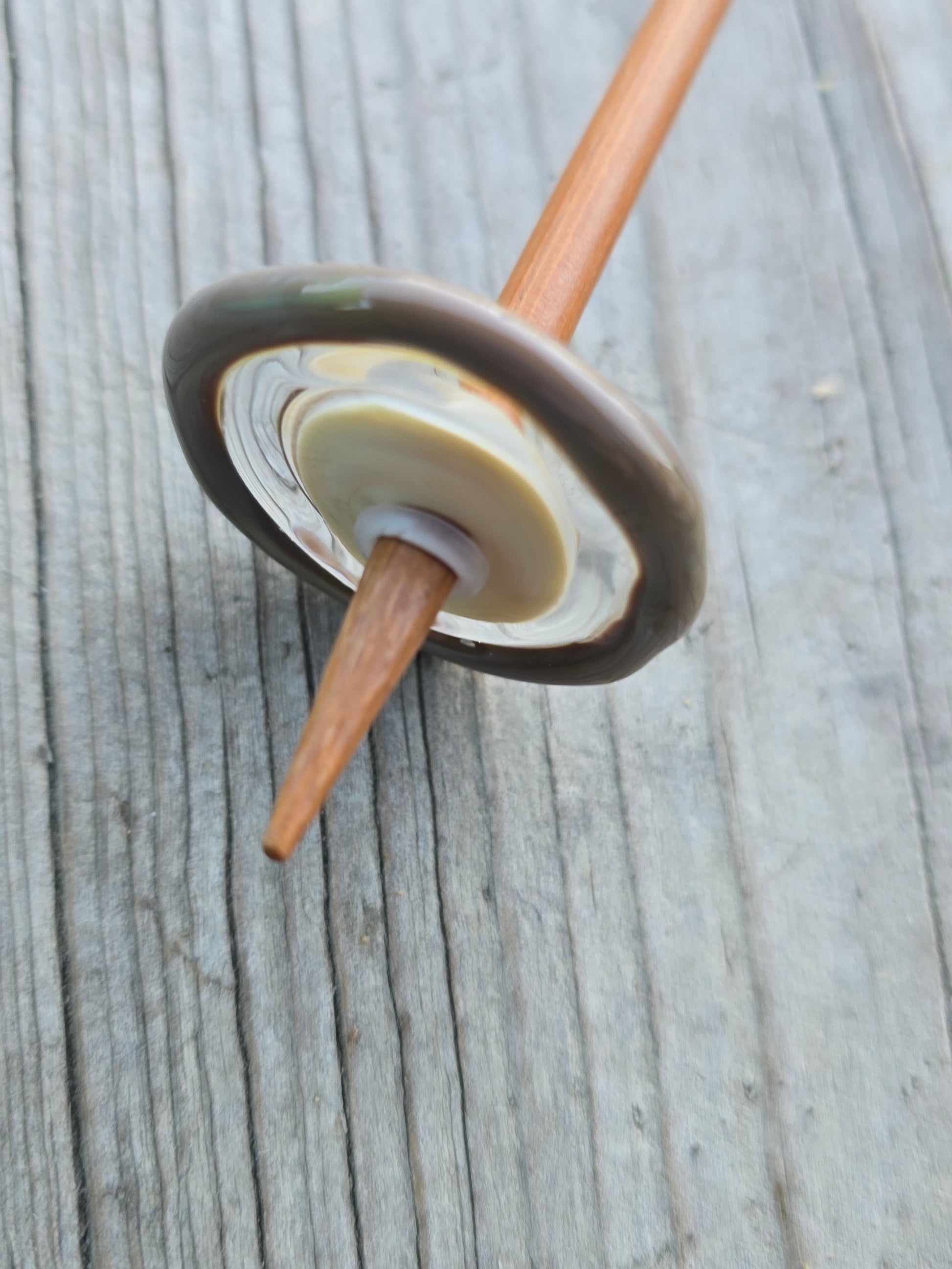 Each spindle is made with a bamboo shaft and a handmade lampwork glass whorl that can be removed once the spindle is full. It comes with a bamboo spinning bowl and 5g of fibre to get you started.