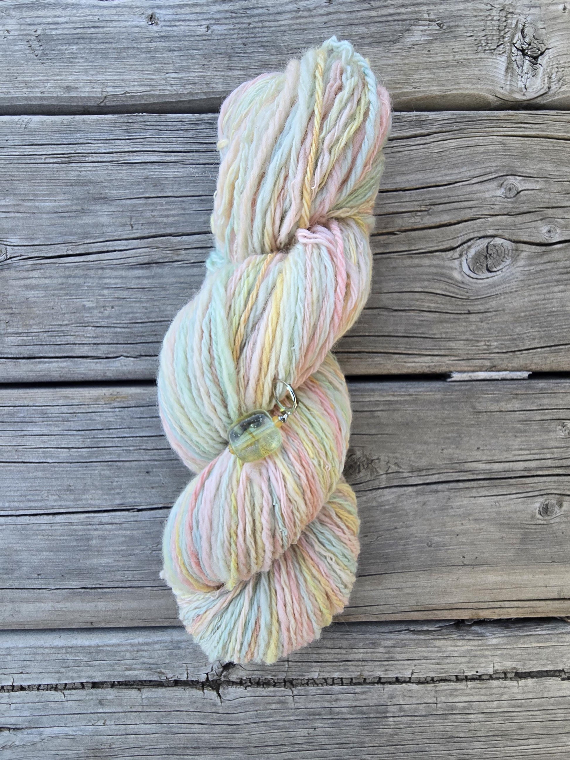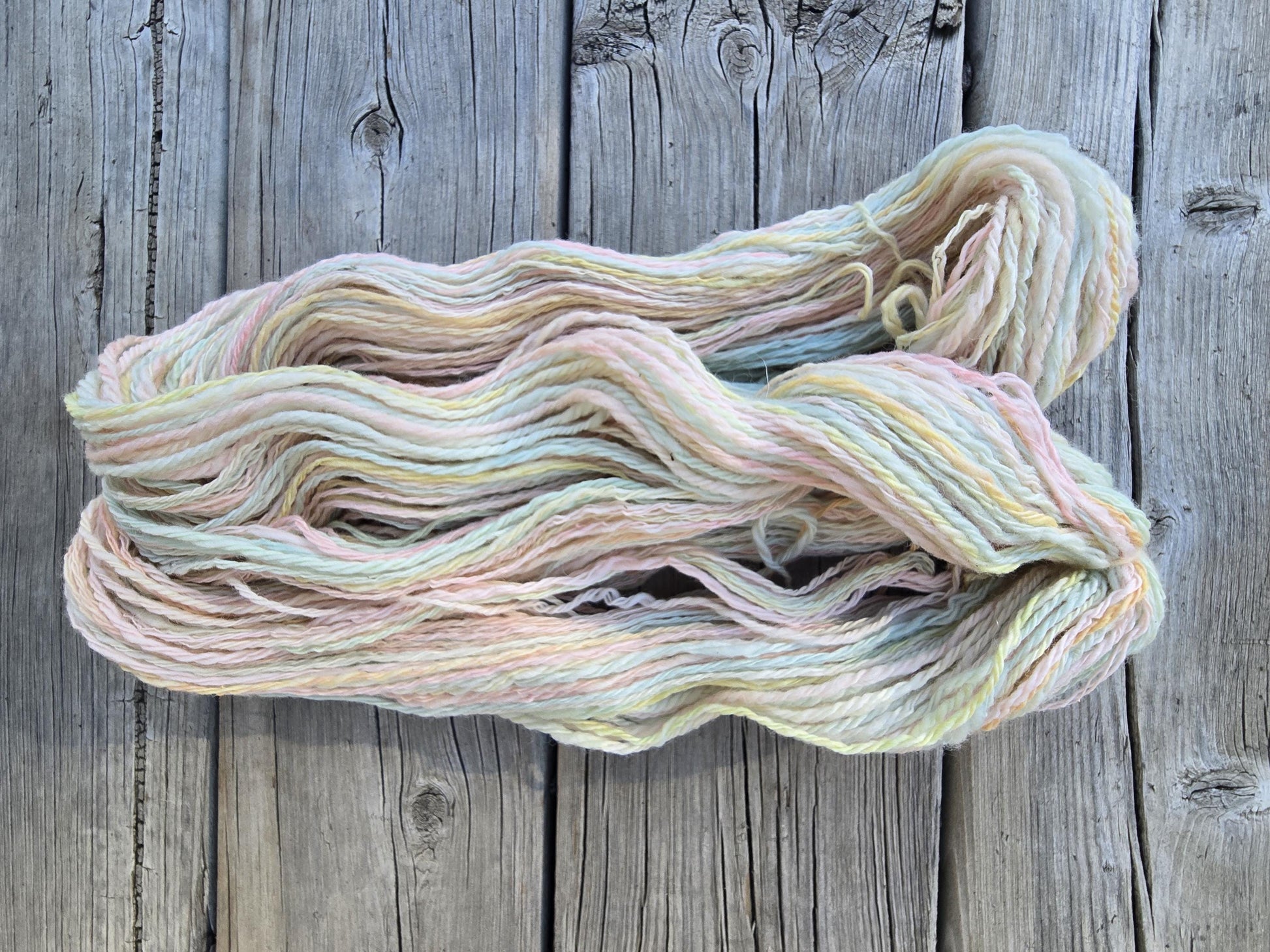 "Care Bear Stare" hand dyed/hand spun art yarn. 100% Polwarth wool. 100g 211m/231 yds. Worsted weight.