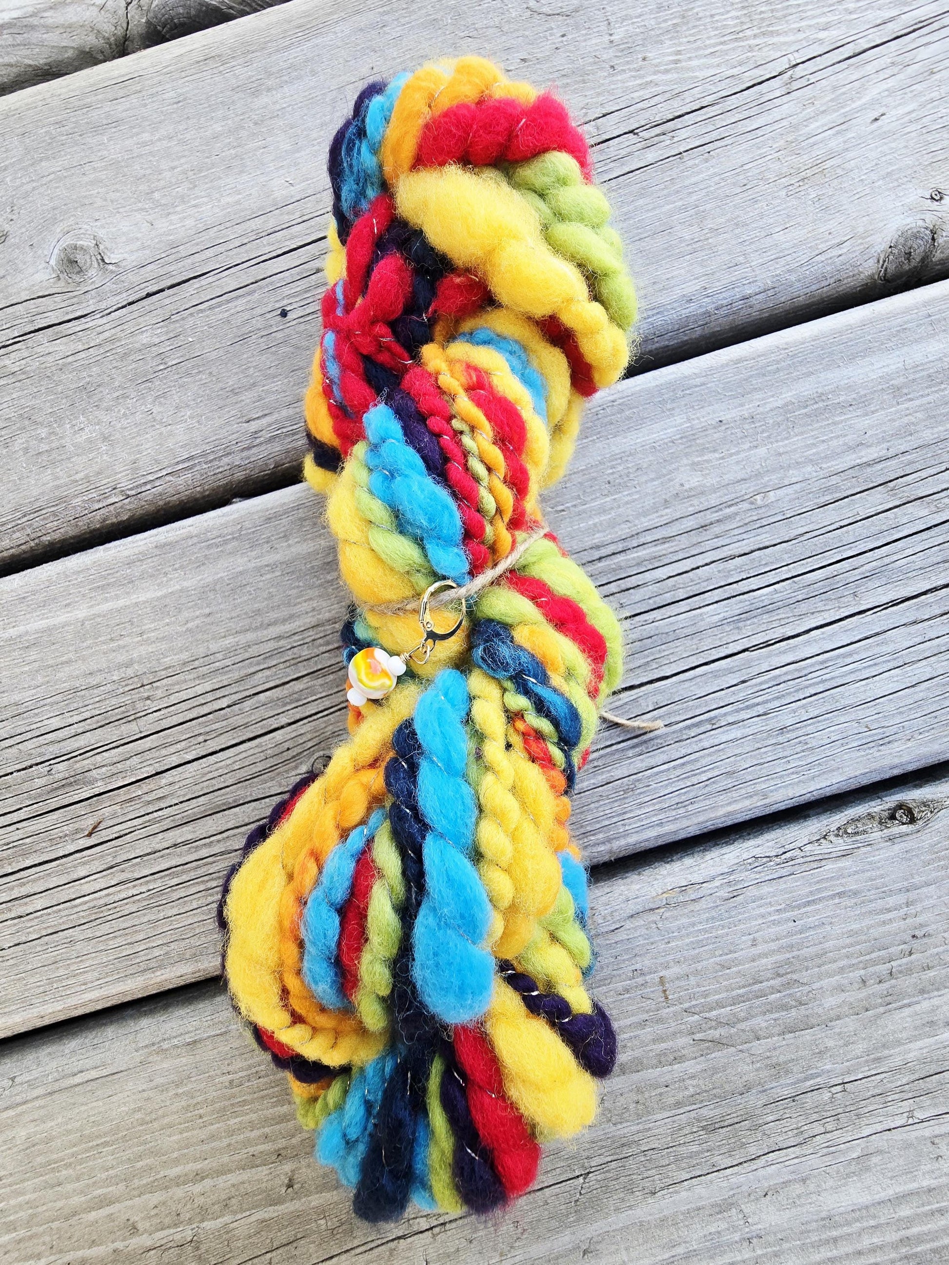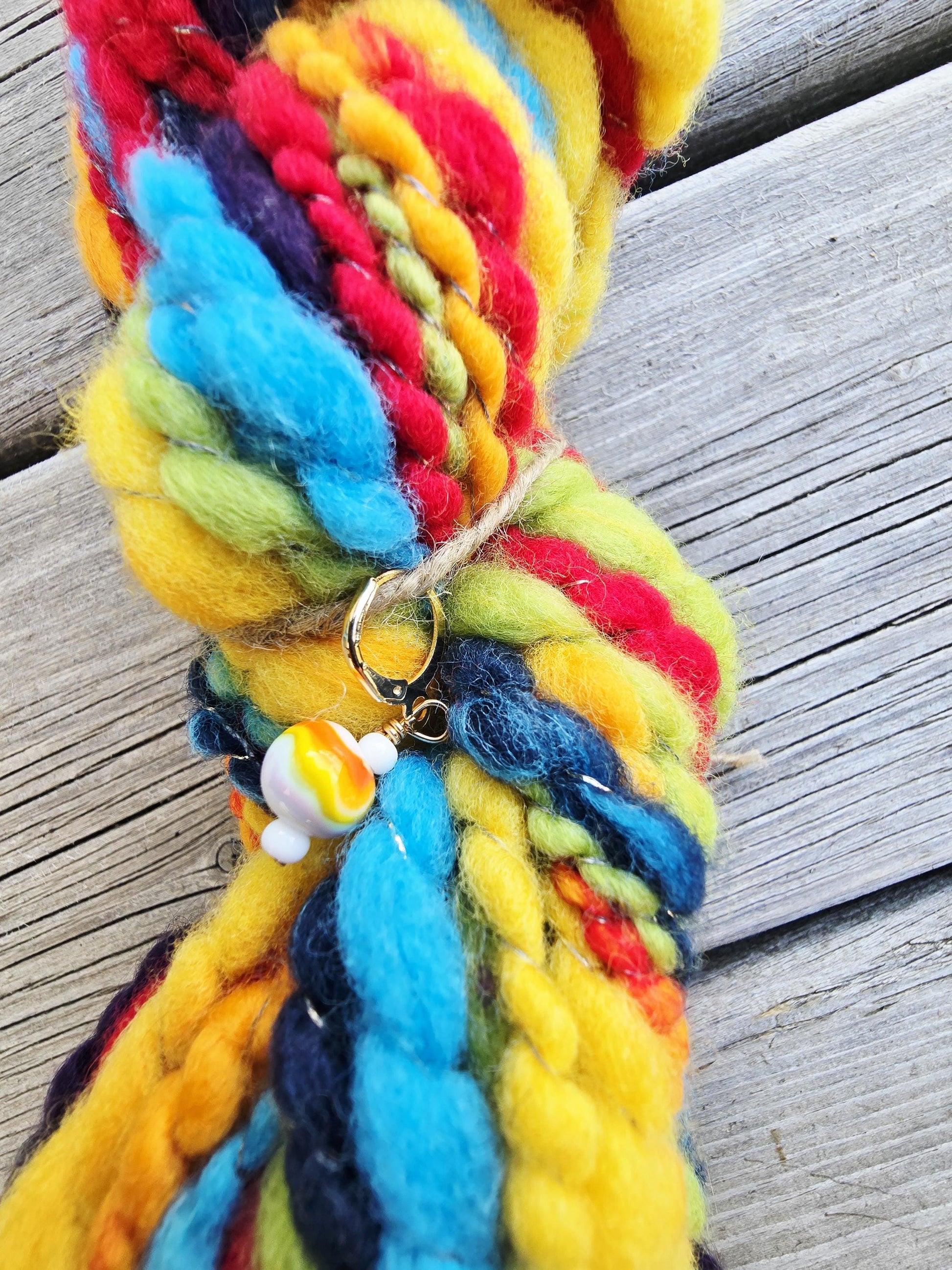 "Pride" hand spun art yarn. 100% Merino & Corriedale wool, plied with metallic thread . 49g 23m/25 yds. Thick & thin. Includes a handmade matching lampwork glass stitch marker.
