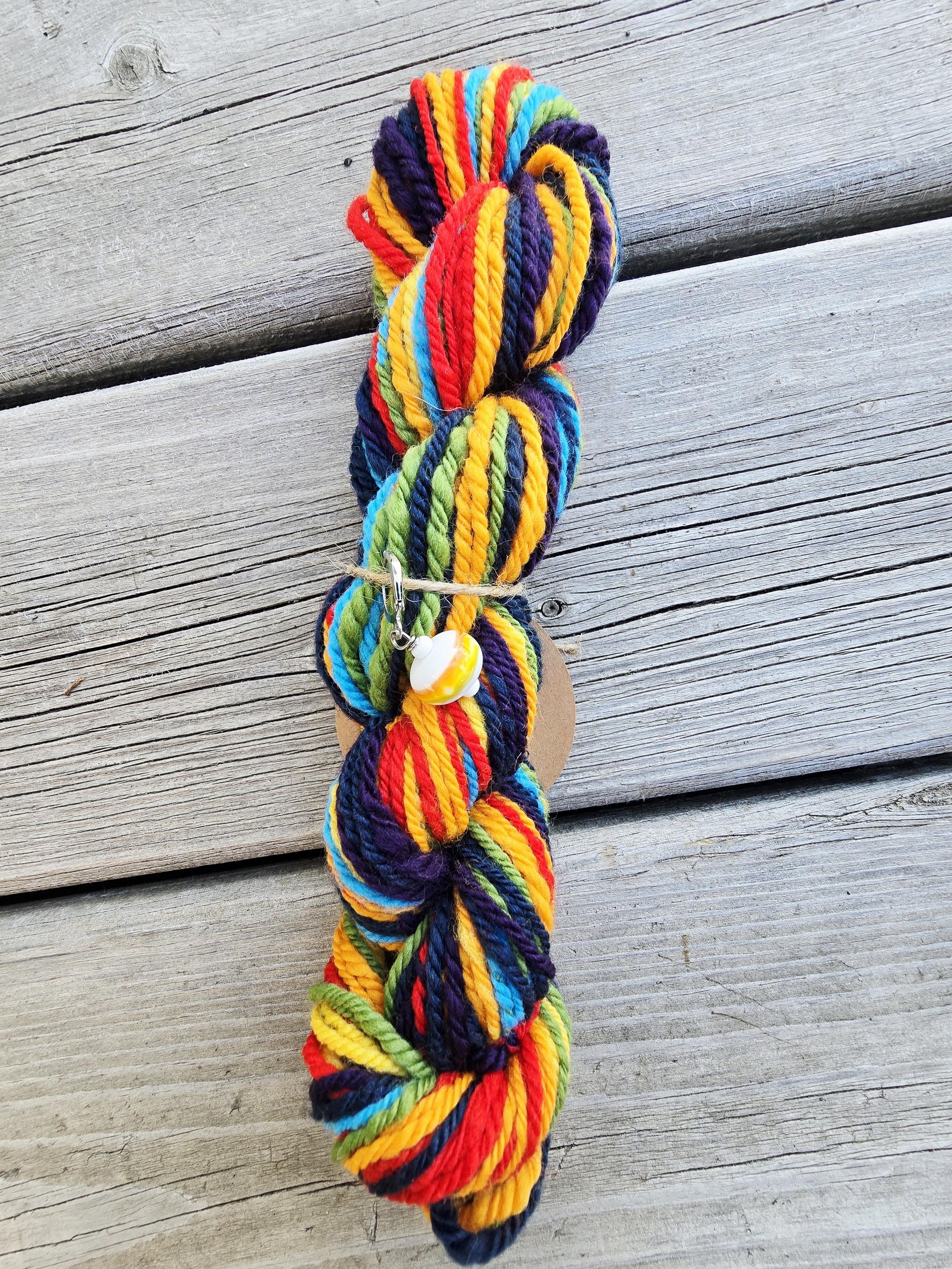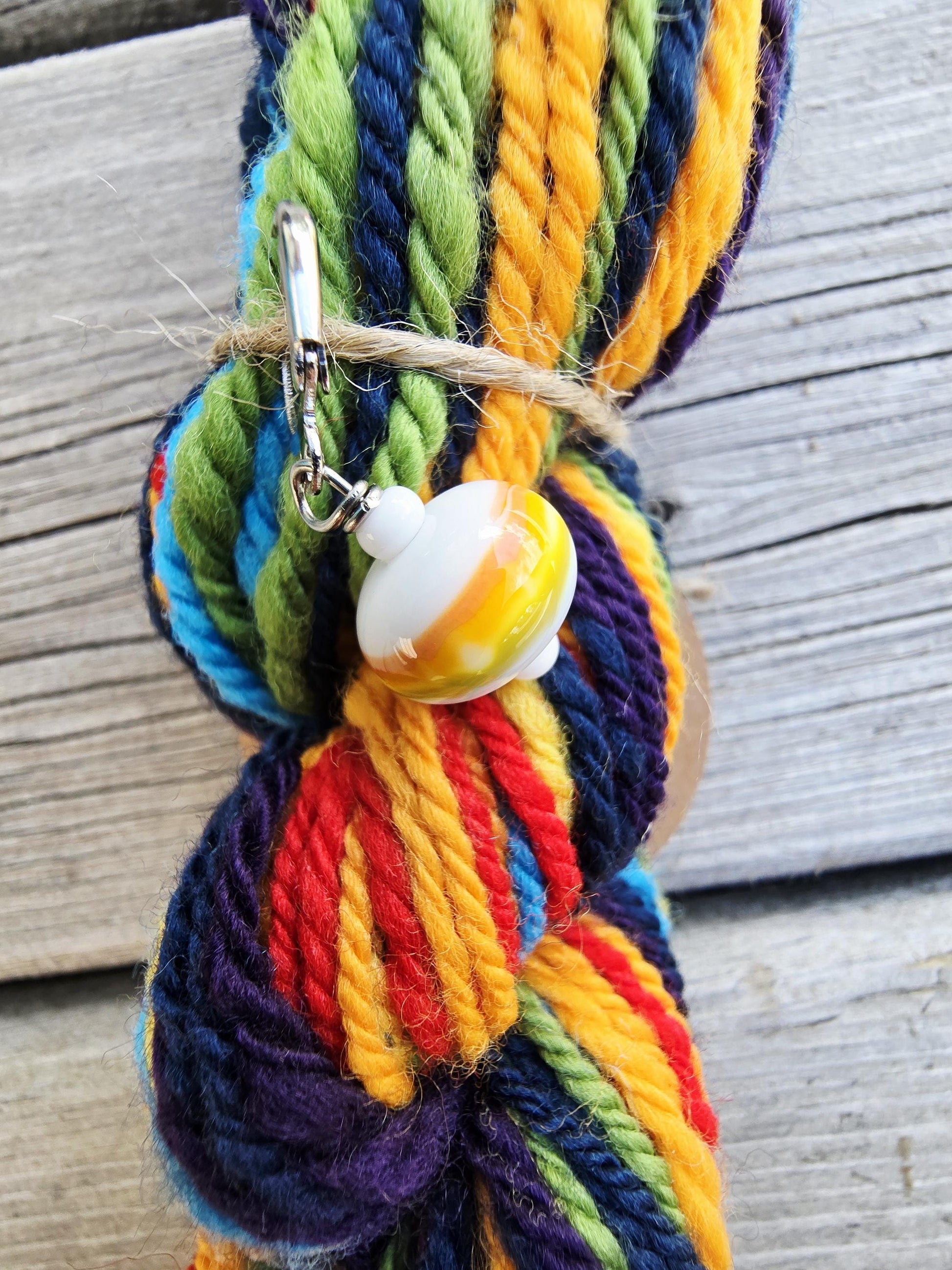 "Pride Too" hand spun yarn. 100% Merino & Corriedale wool. 39g 33m/36 yds. Worsted weight. Includes a handmade matching lampwork glass stitch marker.