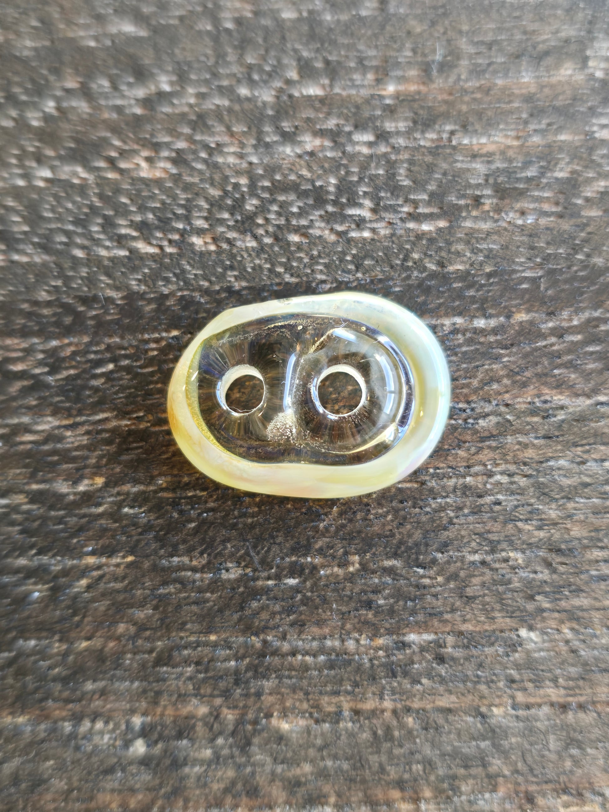 I make these buttons using Italian glass in a glass blowing torch. They are kiln annealed for durability