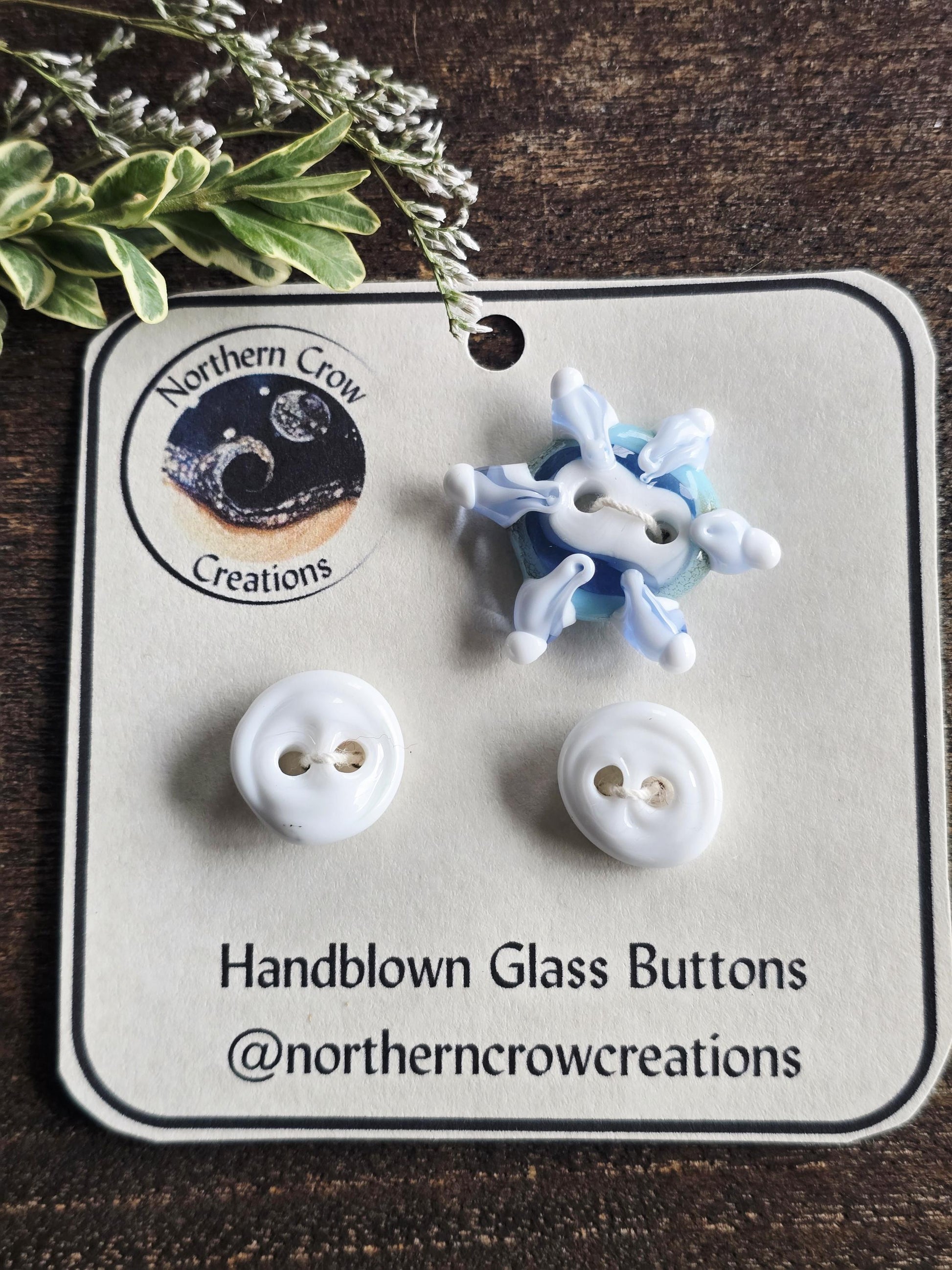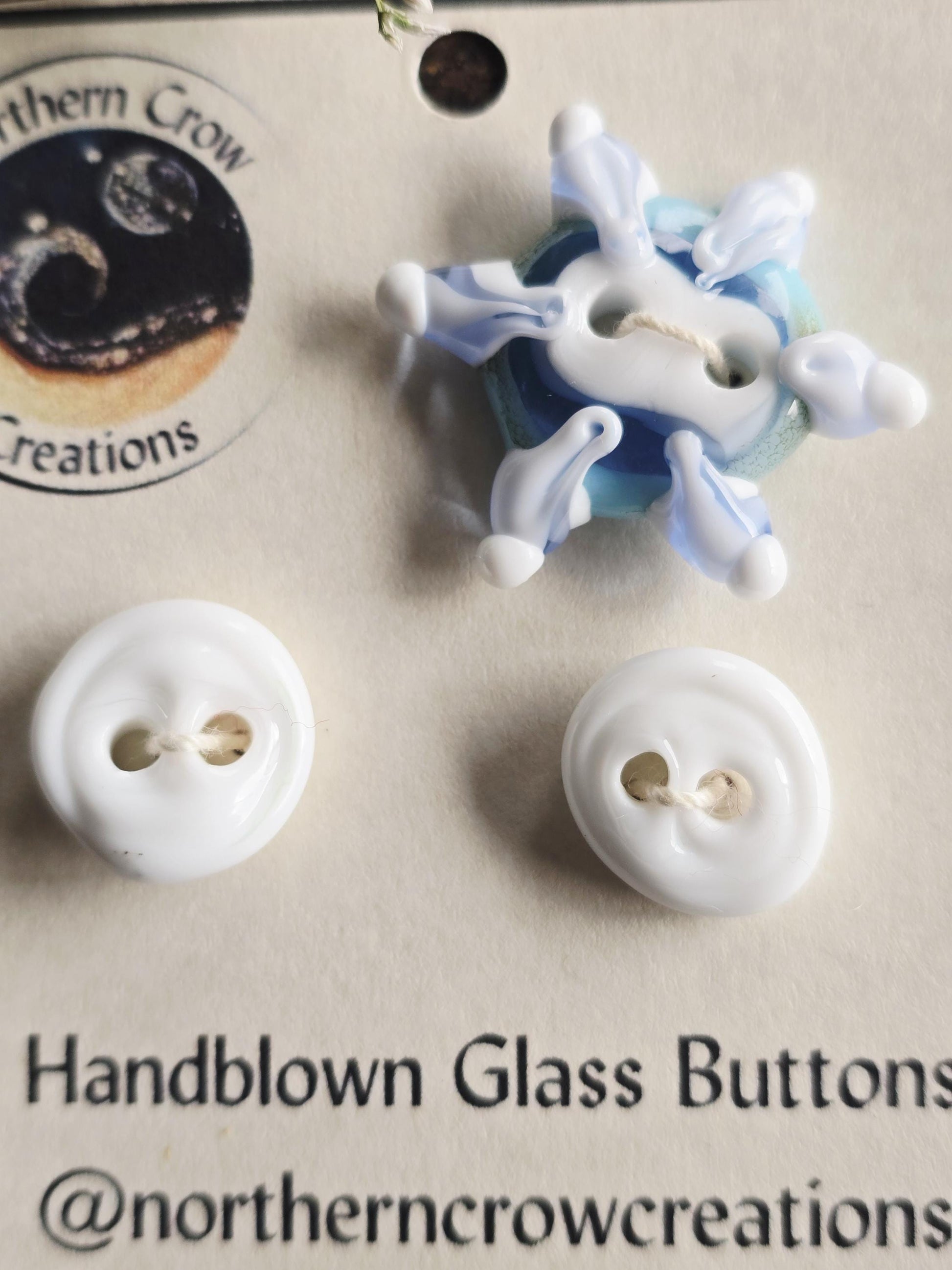 Set of 3 handmade lampwork glass buttons. I handmade these buttons using Italian glass in a glass blowing torch. They are kiln annealed for durability. These buttons measure approximately 3/4"/23 mm to 1"/25mm in diameter. They include 2 round and 1 snowflake buttons.
