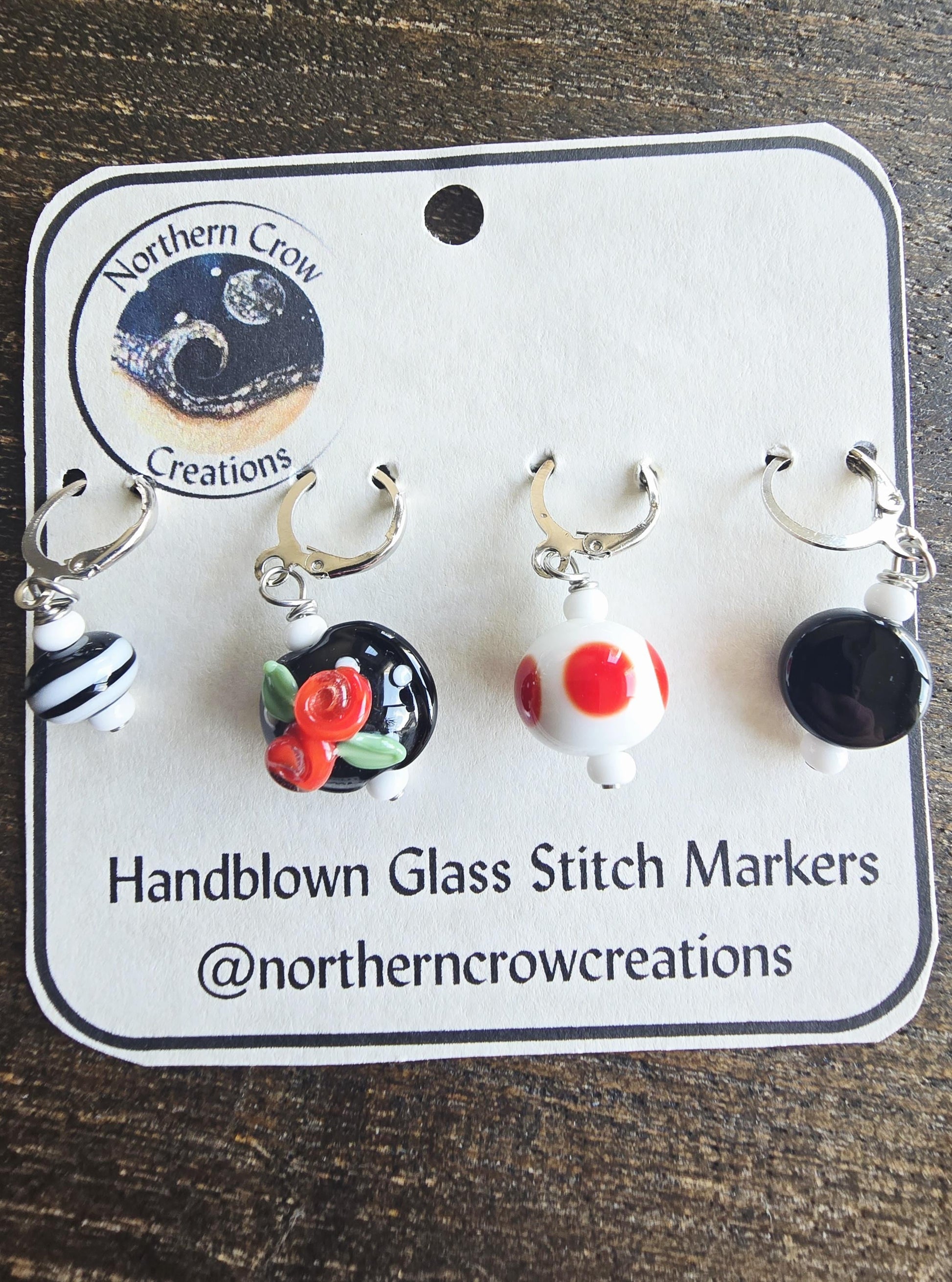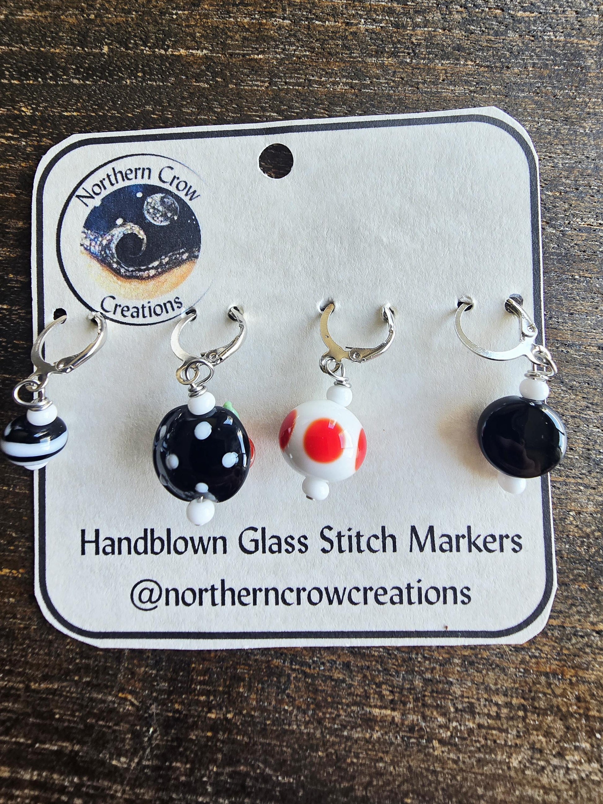 Set of 4 handmade lampwork glass stitch markers. The beads for these stitch markers are handmade using Italian glass in a glass blowing torch. They are kiln annealed for durability. They measure approximately 3/8" / 10 mm to 6/8" / 20mm in diameter. The clasp opens making them perfect for both knitting and crochet projects.