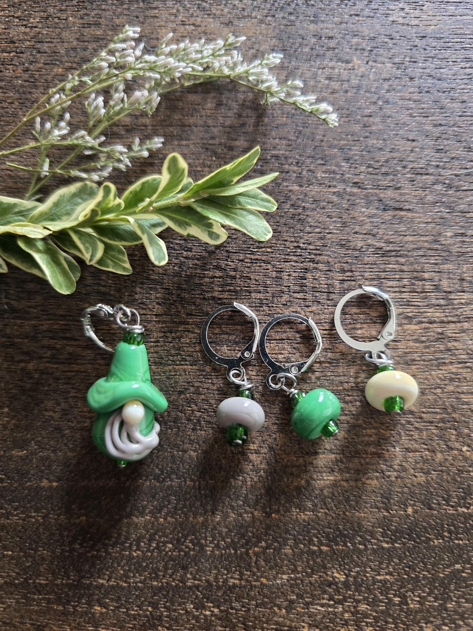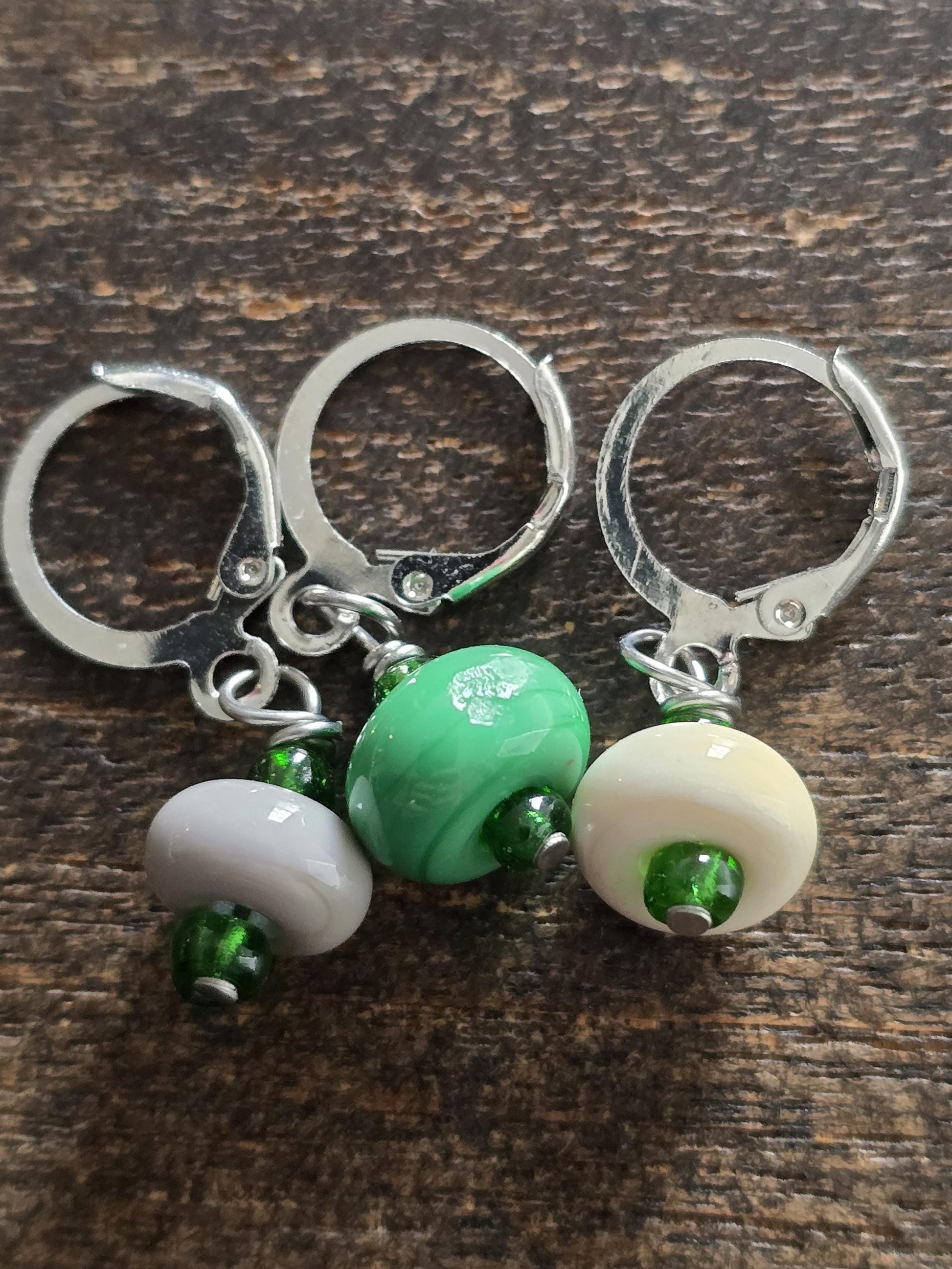Set of 4 handmade lampwork glass stitch markers. A progress keeper with 3 matching stitch markers. I hand make the beads for these stitch markers using Italian glass in a glass blowing torch. They are kiln annealed for durability. The clasp opens making them perfect for both knitting and crochet projects, and for use as stitch markers and projects keepers.