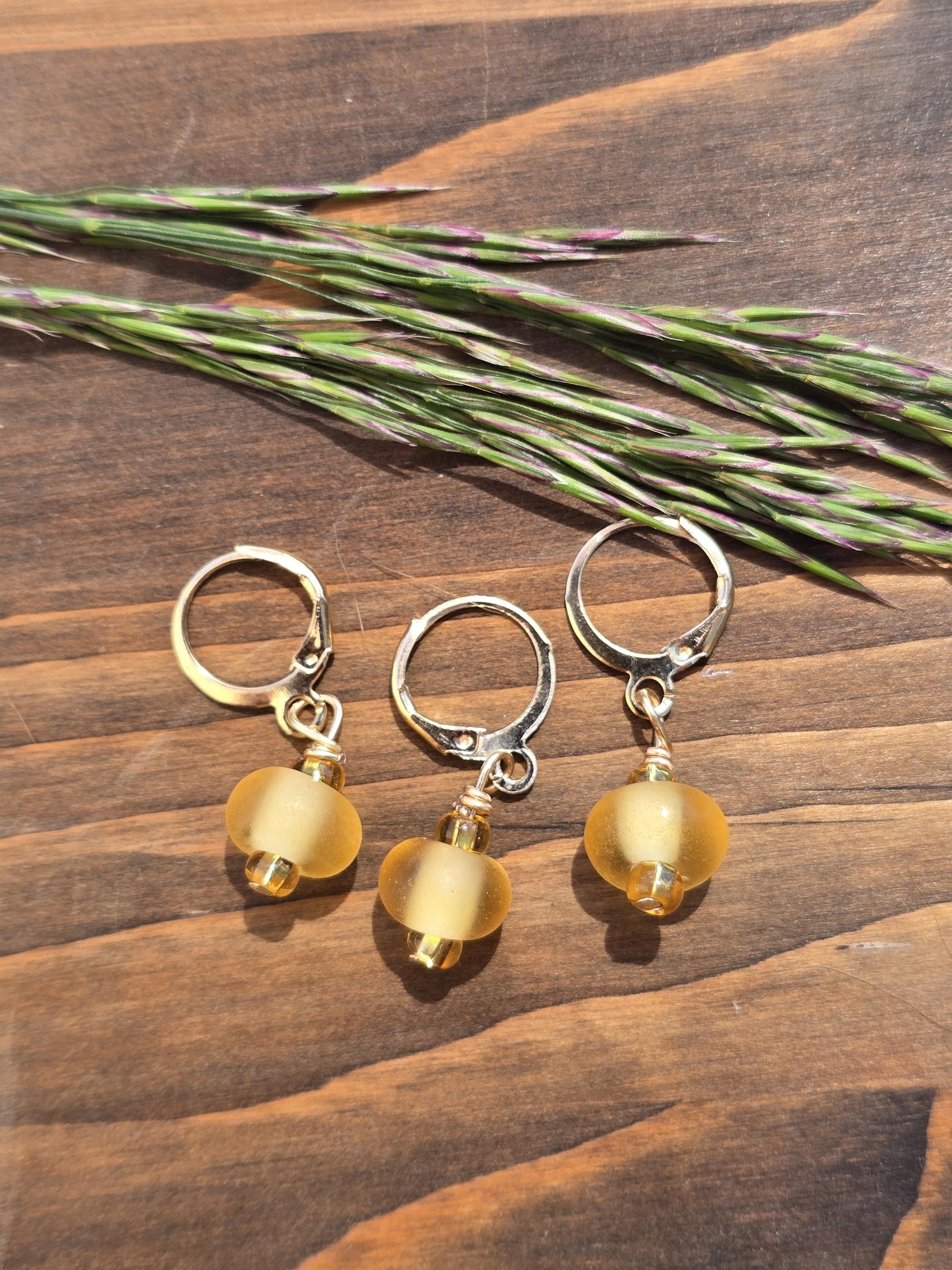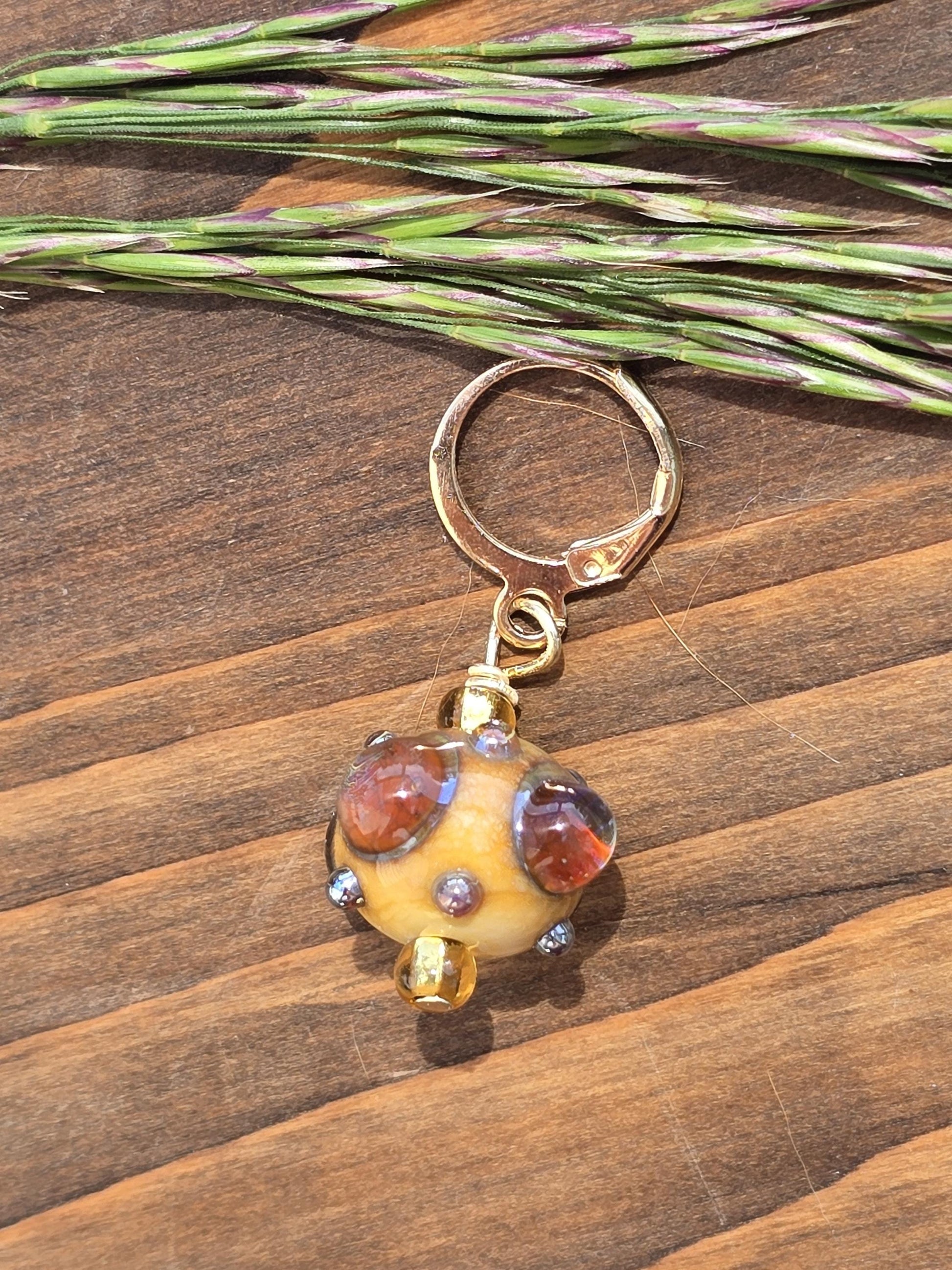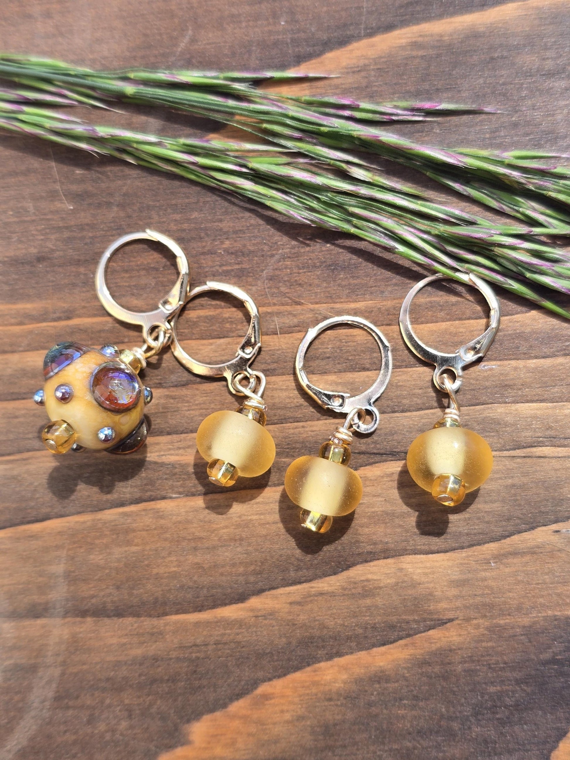 I hand make the beads for these stitch markers using Italian glass in a glass blowing torch. They are kiln annealed for durability. The clasp opens making them perfect for both knitting and crochet projects, and for use as stitch markers and projects keepers.